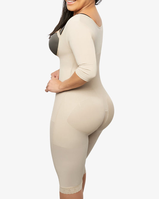 Knee Length Shaping Bodysuit With Sleeves High-Back Recovery Compression Garment Shapewear With Straps For Women